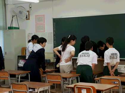 今日は、1年生の美化委員も、3年生の美化委員がどのようなチェックポイントを見ているのかを事前学習していました。住吉第一中学校は、訪問者から「掃除が行き届いていますね」とお褒めの言葉をいただきます。これからも、ホコリ(誇り)というプライドを集めていってください。