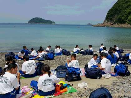 5月15日(金)正午前、定刻通り「日高少年自然の家」に到着。歩いて坂を下り、海岸の砂浜に集合しました。潮の香りや心地よい浜風を受けながら、浜辺でいただく家庭弁当の味は、格別だったようです。「来た時よりもきれいにしよう!」がマナー。波打ち際のごみも含め、美化委員と協力し、みんなで2日間使わせていただくビーチをきれいにしました。