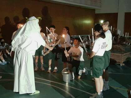5月15日(金)、夕食後のメインプログラムは、この日のために準備を重ねてきたキャンドルファイヤー。♪遠き山に日は落ちて・・・♪の大合唱後に、校長先生が扮する『海の神』が登場。聖なる火を各クラスの代表に分け与え、クラスごとに誓いの言葉を告げていきました。いよいよ心を一つにし、一斉に燭台に点火。♪燃〜えろよ、燃えろ〜よ・・・♪と、希望の火の前で誓った言葉は、決して忘れることはないでしょう。