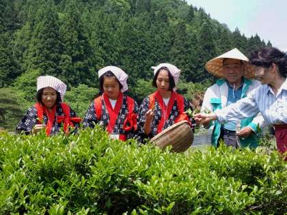 作業体験は、各家庭で趣向を凝らしたもの。田んぼや畑、果樹園や茶畑での仕事、田舎料理や特産品づくりなど、生徒たちにとっては、何でも初の「人情田舎体験」。写真にある各班では、今日の食材となる野菜収穫や衣装も着付けていただいて、茶畑での茶摘みをさせてもらってました。