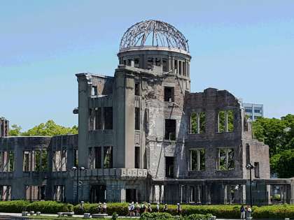 5月21日(木)午前、安芸太田町を後にし,広島市内に向かいました。バスは、太田川沿いに下って行き、昨年、土石流の被害に見舞われた辺りも通過して行きました。市内中心部では、車窓から原爆ドームを横に見て平和記念公園に到着。早速、広島平和記念資料館の館内を見学しました。