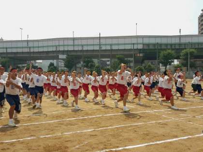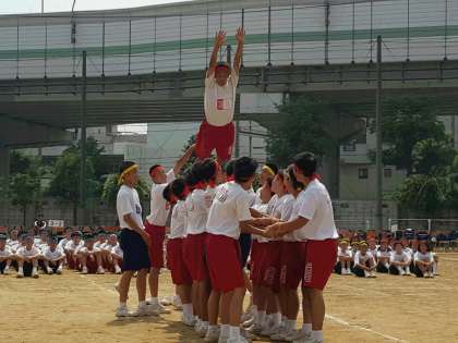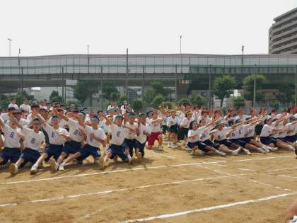 まず初めはHAPPILY(はっぴりぃ)。練習では苦労していましたが、本番では気持ちを込めた見事な演技。続いてガンバルジャー。1クラス多い人数で、大きな動きと声で他を圧倒。最後は住一413。クライマックスは人間ロケットで、ダイナミックな演舞。生徒たちの表情には、やり遂げた満足感や充実感。力を出し切った完全燃焼!どのチームも甲乙つけ難く、いつまでも声の響きが余韻として残るすばらしい出来栄えでした。