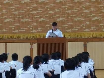 9月1日(火)6限、今日は2年生の「私の意見」選考会。各クラス2名ずつ、6名の生徒による発表でした。それぞれの作文は、身のまわりの出来事や報道、書物に目をやり、夏休みの課題として提出されたものです。