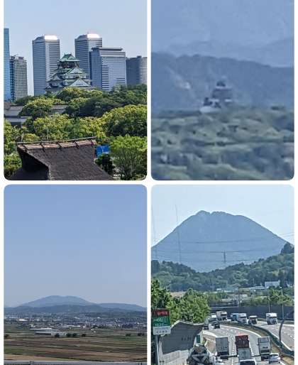 車窓からの景色。 大阪城、伏見桃山城、近江富士。