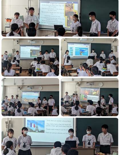 2年生の英語の授業です。 班で世界の国や地域を調べて、英語でプレゼンテーションをしています。