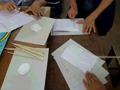 クラスで分担制作したちぎり絵も、いよいよ完成間近。木工用ボンドを割りばしなどで、薄く引き伸ばし塗っていきました。各自が作業をしている時は、原画どおりの仕あがりになるか不安があったようですが、まずまずの出来に一安心。さらに、部分的な修正を加えてお披露目に至るようです。展示作品「ちぎり絵」も、みんなで一つの力作になりつつあります。