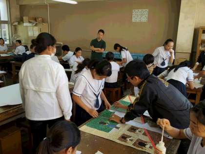 10月2日(金)放課後、美術室では各クラスの係生徒が集まり、一人一人が丹念に、色紙を小さくちぎって作った36枚のパート絵を、大きな紙に貼りあわせていきました。テーマは「学校生活」を描写したもの。