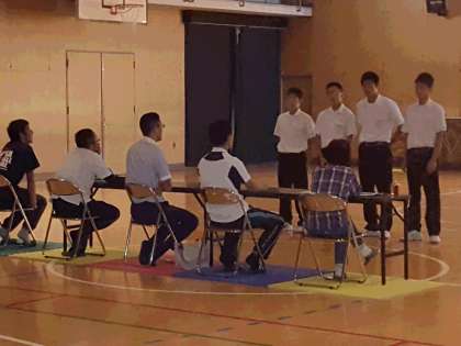 出演者は、3年生「カイワレボンバー」「IS and NT」「超新星」と1・2年生「男子ハンドボール部」のメンバー。舞台での息の合った動きやテンポの良いかけ合いが、審査の先生方にもウケていました。本番では、より内容が深化されたものとなり、舞台度胸満点の演技にも磨きがかかることでしょう。皆さんに・・<笑>・・を十分提供できそうです。
