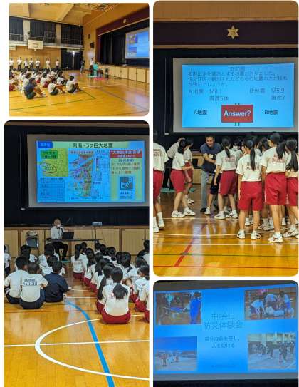 地域青少年指導員の方々の主催で防災体験会が実施されました。70人ぐらいの生徒が参加。区役所の方から防災について学んでいます。
