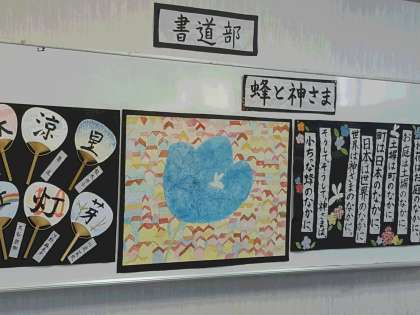 10月8日(木)、文化部では個人作品や共同作品の展示があります。多目的室では、書道部が、共同作品「蜂と神さま−金子みすゞ」個人作品「色紙・うちわ」など、情緒や風情を感じさせる「詩や書」の作品。