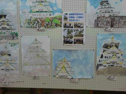 工作室では、家庭科部が、個人作品として「ゆかた・マフラー・エプロン」など、丹念に仕あげた作品。美術部は、個人作品「イラスト」と夏休みに校外で写生した「大阪城」。また、美術部の共同作品として、テーマを見事に描き、格技室壁面に巨大作を早々から掲げてくれています。