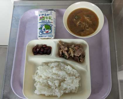 豚肉の甘辛焼き、とうがんのみそ汁、金時豆の煮もの、ごはん、牛乳。