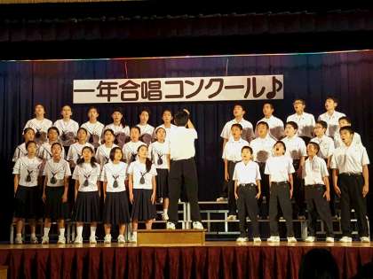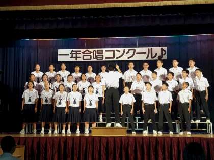 合唱での1番目の演奏は、1年2組【写真左】。課題曲は「友達でいようね」、自由曲は「Best Friend」でした。特に、緊張が高まる1番手ですが、堂々としたものでした。2番目の演奏は、1年3組【写真右】。自由曲は「さくら」。声の大きさや歌う表情が、とても良かったです。