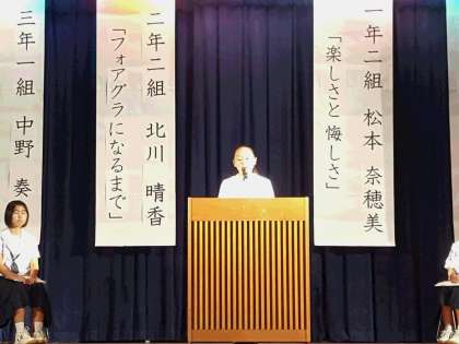 10月9日(金)、1年生の舞台発表は午前中に行われました。まず最初に登壇したのは、7月の住之江区「社会を明るくする運動」作文之部に応募し、優秀作品に選ばれた発表者【写真中】。題は「優しさのあふれる社会」でした。人のためになりたいという、立派な思いが述べられました。