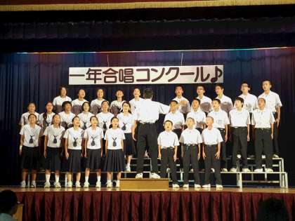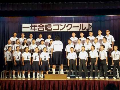 合唱での3番目の演奏は、1年4組【写真左】。自由曲は「世界に一つだけの花」でした。歌が伝えたい思いが上手に表現できていました。トリとなる4番目の演奏は、1年1組【写真右】。自由曲は「想い出がいっぱい」。静寂に満ちた体育館に、混声のハーモニーが美しく響きました。