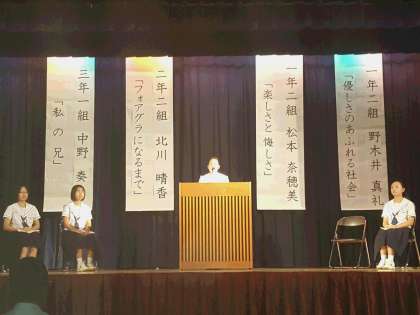 10月9日(金)、1年生学年選考会で選ばれた『私の意見』発表者【写真中】は、「楽しさと悔しさ」と題しての意見でした。今年新たに創部されたソフトテニス部に入部して、初めて試合に出場して感じた素直な気持ちや心の葛藤、これからの強い意志が伝わる素晴らしい発表でした。