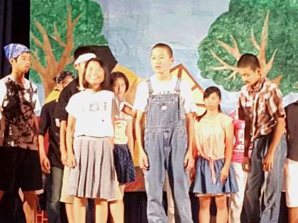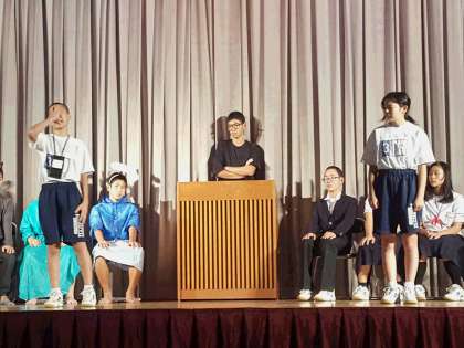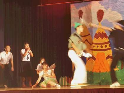 2年3組は「Stop!環境破壊」。地球全体の環境問題について、ユニークな演出も入れ、海の裁判所が確かなメッセージを伝えてくれました。3年2組は「ピーターパン」。大人になれることの喜びや、大切さを表現していく中で、戦闘シーンなどでは熱演。迫力ある演技が見られました。2年1組は「嵐の中の子どもたち」。出演者が、勇気と友情を感じさせてくれる息の合ったミュージカル。笑顔の表情に清々しい印象を得ました。