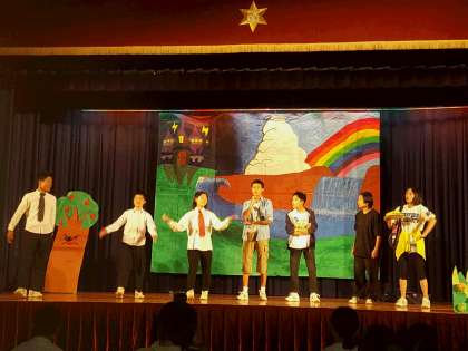 3年3組は「くるみわり人形」。一足早いクリスマス雰囲気、個性的なキャストたちが絶妙のトークで、呪いを解く世界へと誘ってくれました。2年2組は「風に立つライオン」。アフリカ風ダンスに始まり、ケニアで医療に奮闘する医師と恋人との恋の行方に、固唾をのんで見入りました。3年1組は「コンピューター オブ オズ」。平和になったオズの国と魔女に支配される世界。夢に悩む中学生の現実も、うまくコラボしてました。