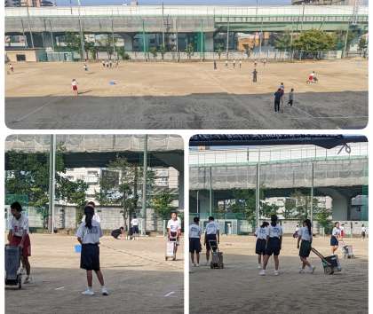 今日から運動会に向けての学年練習等が始まります。体育委員の人が朝早くから集まってラインを引いています。