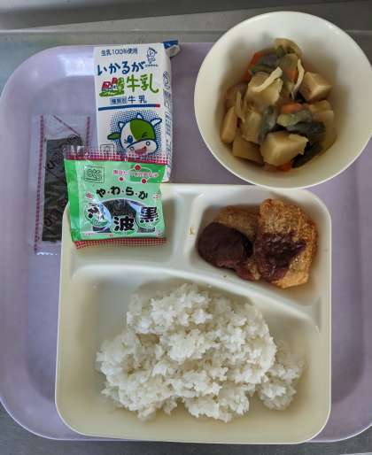 みそカツ、じゃがいもと野菜の煮もの、焼きのり、ソフト黒豆、ごはん、牛乳。