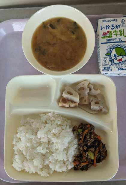 もずくと豚ひき肉のジューシー、さつまいものみそ汁、焼きれんこん、ごはん、牛乳。