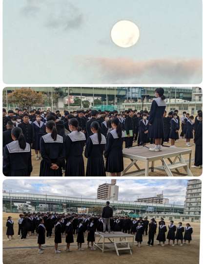 全校集会の様子です。 朝早くには西の空に満月が見えました。