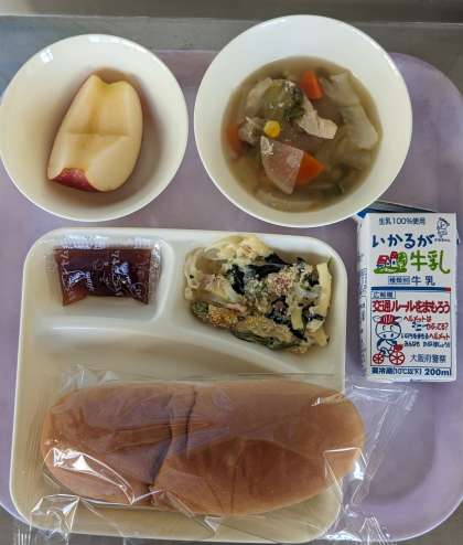 ほうれんそうのグラタン、スープ煮、りんご、パン、いちごジャム、牛乳。