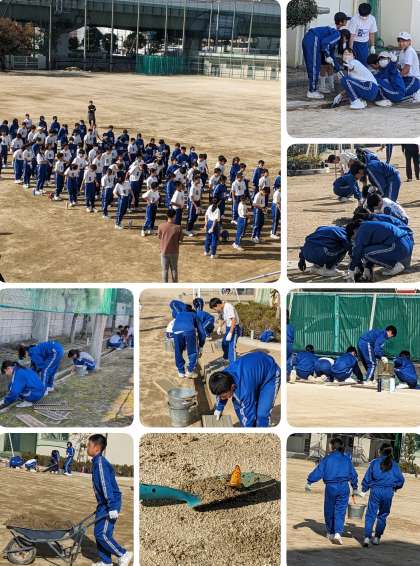 午後、グランドの側溝の清掃をしました。溝にたまった土を上げて、排水を良くします。汗ばむ陽気の中、頑張りました。