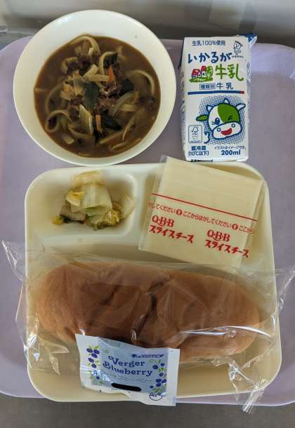 カレーうどん、はくさいのおひたし、スライスチーズ、パン、牛乳、ブルーベリージャム。
