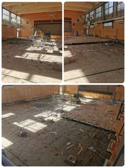 本日の体育館の様子です。床板がほぼ無くなっている状況です。