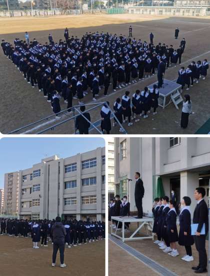 快晴の朝、冷え込みましたが、グラウンドで始業式をしています。