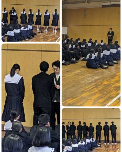 2年生の学年集会です。 昨日のマラソン大会の表彰をしています。 優勝は2年3組です。