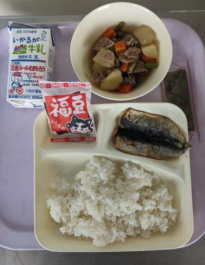 節分の行事献立 いわしのしょうがじょうゆかけ 含め煮 いり大豆 焼きのり ごはん 牛乳
