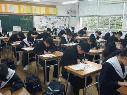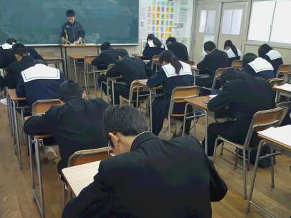 11月2日(月)6限、3年生各クラス一斉に「英語能力判定テスト」を実施しました。このテストは市内全中学生が対象で、筆記およびリスニングテストを3年生はこの時期、1・2年生は2月上旬に行います。生徒たちに求められる英語力や学習の習熟過程等を把握・検証し、各生徒の英語力の把握と、学習指導の改善・工夫に役立たせる目的で実施しています。