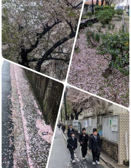 雨は止みましたが、桜の花びらがたくさん散る中の登校です。