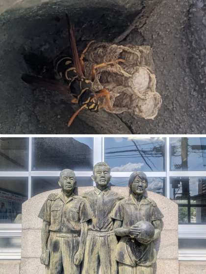 1年生が、正門を入ったところにある像に蜂が巣を作っていると教えてくれました。