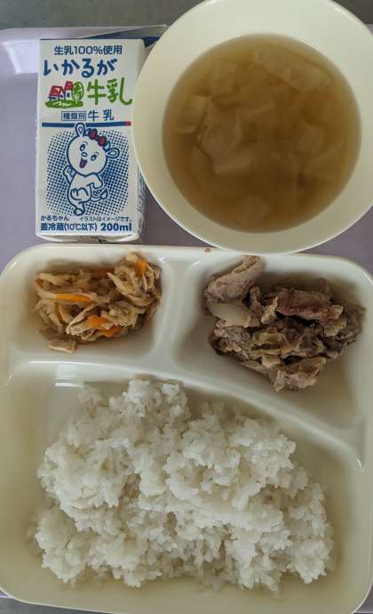 豚肉のごまみそ焼き、すまし汁、切干しだいこんのいため煮、ごはん、牛乳。