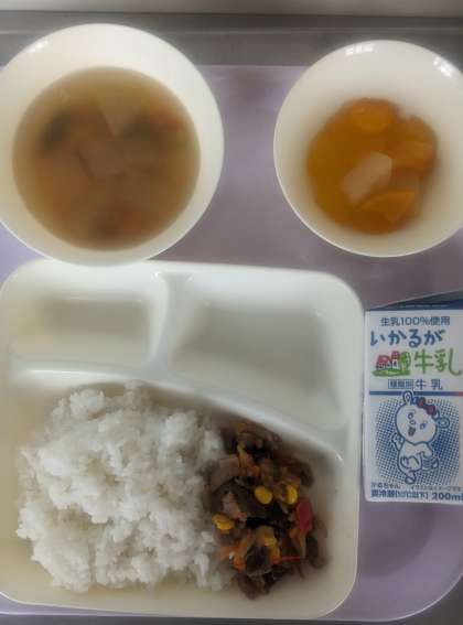 令和5年度学校給食献立コンクール優秀賞 夏野菜飯、パワースープ、トロピカルゼリー、ごはん、牛乳。