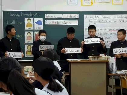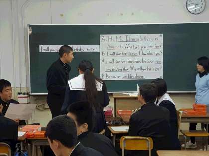 本時は、基礎クラス発展クラスとも、前時の既習文型を引用しての言語活動。新出単語の復習をペア学習で行った後、文型内容をより理解するため、グループ学習の形態で示されたスキットを創作し、グループ間で発表していきました。生徒たちは、学びの楽しさも感じているようでした。
