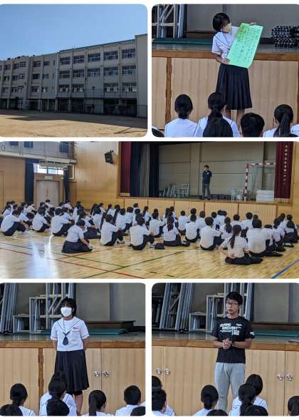 雲一つない青空の快晴です。 3年生の学年集会をしています。