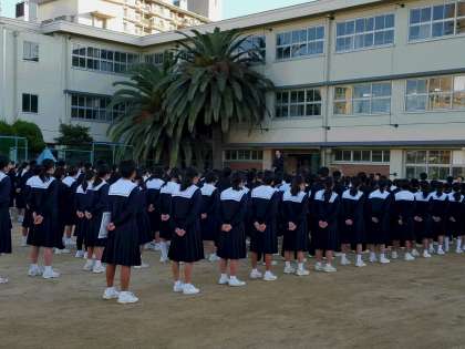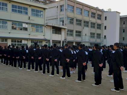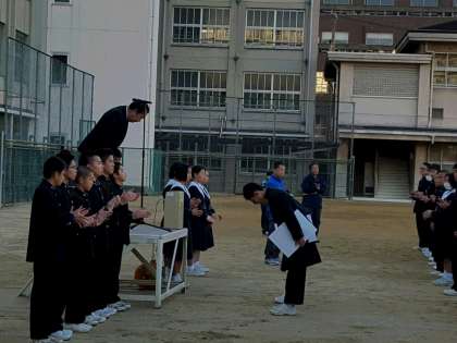 12月7日(月)、先週末に吹き荒れた強い風が収まり、穏やかな朝を迎えました。長らく運動場に集まる機会はありませんでしたが、久々となる全校朝礼。いつものように8時15分の生徒会役員の呼びかけで、点呼整列完了。最初に、少し間が空いた感もある部活動賞状伝達がありました。