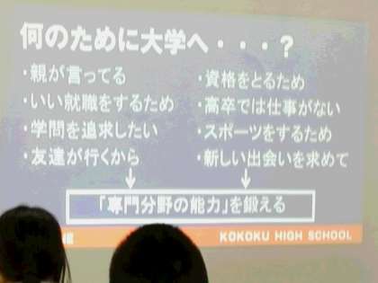 興國高等学校に講師を依頼した「大学進学講座」では、大学に行くのは何のため?、成功の秘訣や取組む姿勢などを、ワークシートを使って考えていく授業でした。「公務員への道」では、今後のキャリア教育実践や進路選択について、自校の学校紹介にもふれながら講義をしていただきました。「サッカー講座」では、基礎基本の個人技であるボールタッチ。キックやパスの技術指導は、模範を示しながら丁寧に教えていただきました。