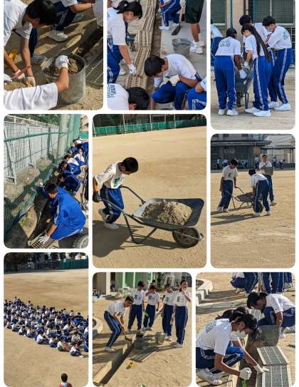 6限、1年生は側溝清掃をしています。