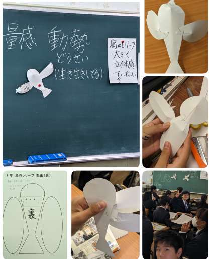 1年生、美術。 型紙で鳥のレリーフを作っています。
