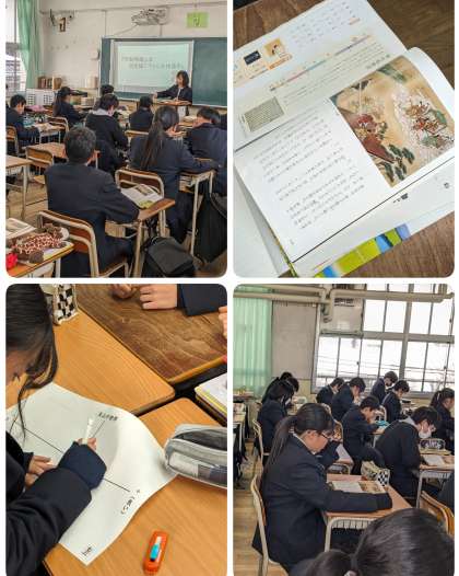 1年生国語 「竹取物語」は何を描こうとした作品なのかをペアやグループで考えています。