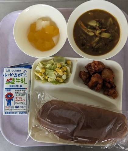 あげどりのバーベキューソース、カレースープ、キャベツとコーンのサラダ、フルーツゼリー、加工パン、牛乳。