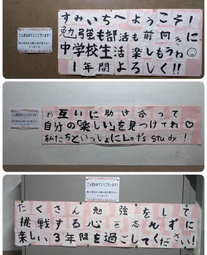新3年生から新入生へのメッセージが掲示されています