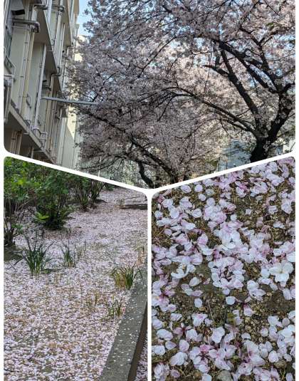 桜の花びらが舞い、地面を覆っています。