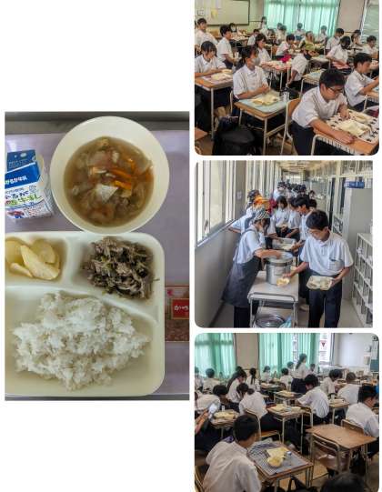 ゴーヤチャンプルー、かつおぶし、五目汁、焼きじゃが、ごはん、牛乳。