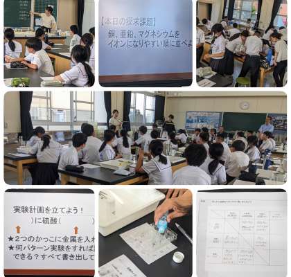 グループで、銅、亜鉛、マグネシウムのうち、イオンになりやすい順を調べる実験を行なっています。